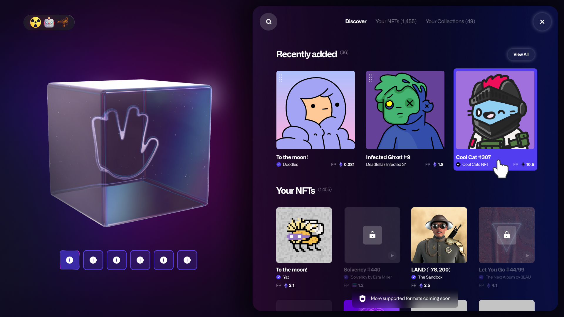 Yat are emoji usernames that become website URL, payment address and more. I collaborated closely with the client for over a year to create a new release of the platform. Working on this project I took the original style and pushed it further keeping everything consistent at the same time. I'm most proud of the work I did for the profile picture element - to host multiple PFPs in one place I came up with the idea to use a cube that rotates and displays different pictures.