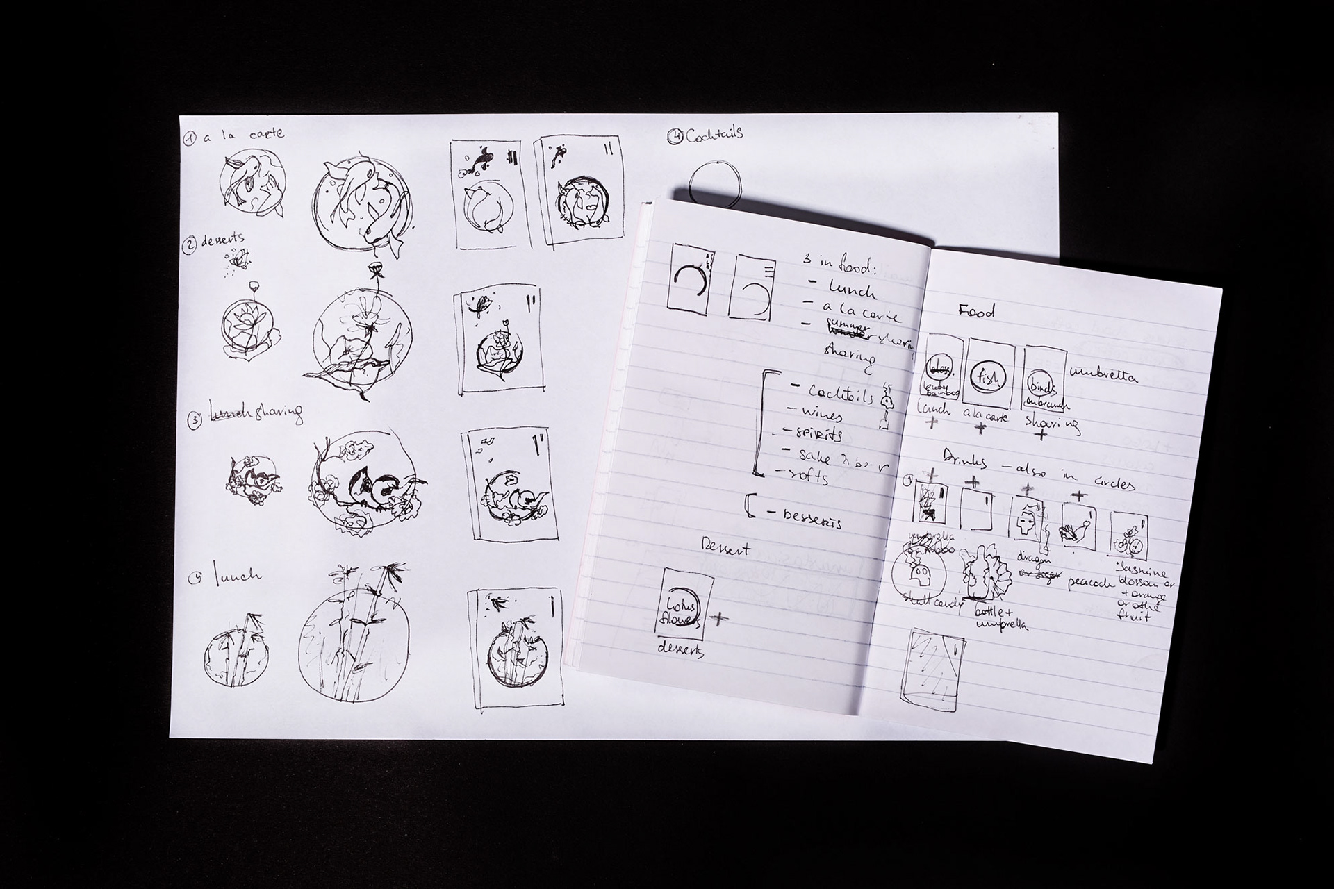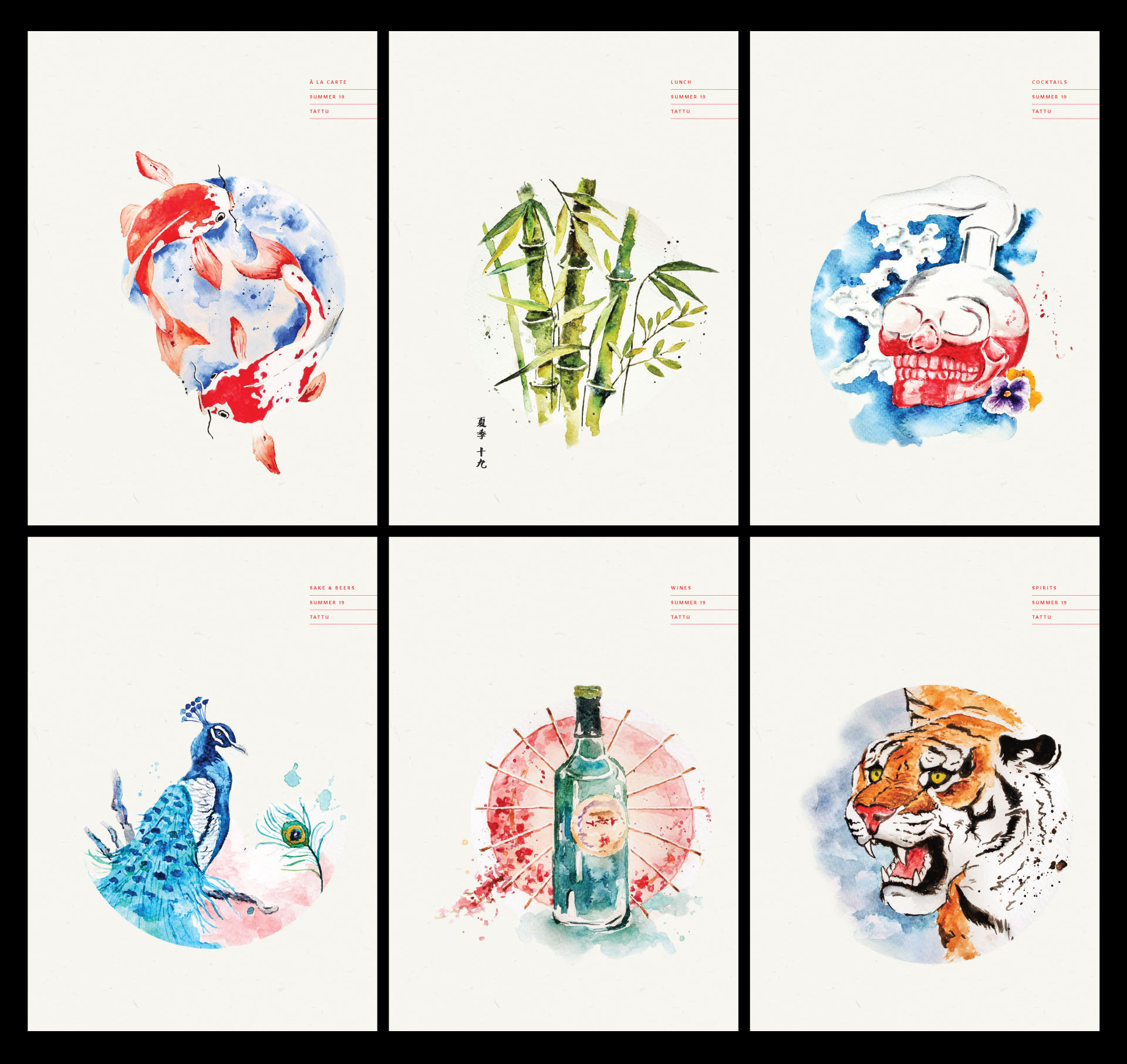 Tattu is a Chinese restaurant in Manchester. I had to design winter bill inserts using foil finish. For spring and summer menus I created bespoke watercolour paintings.
